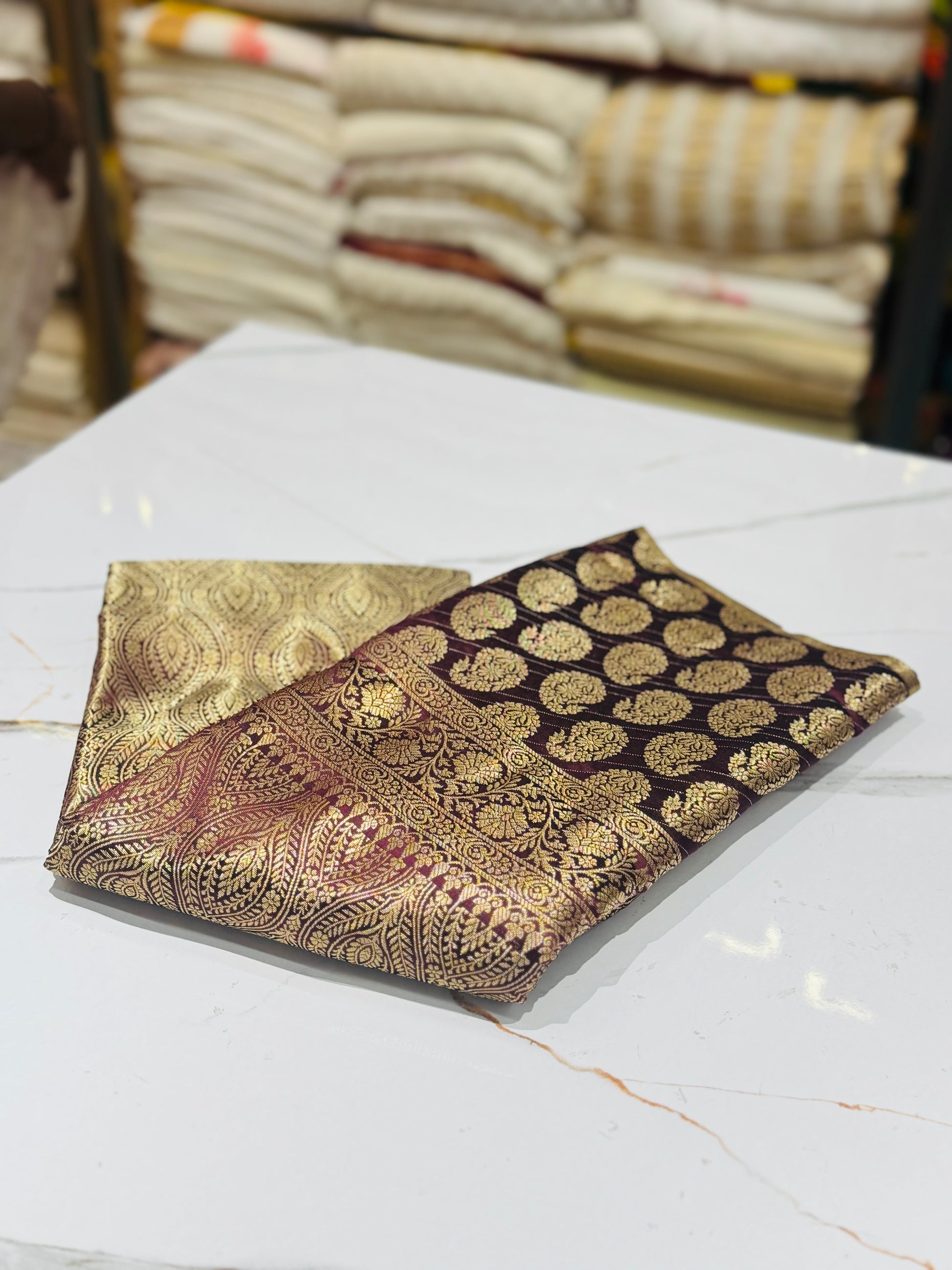 BANARASI SAREE- handwoven with intricate zari work and traditional motifs the body of the saree is completely in Banarasi work and the border is in mango motifs design and blouse piece is in the same tone of the saree with a simple Banarasi border in the end
