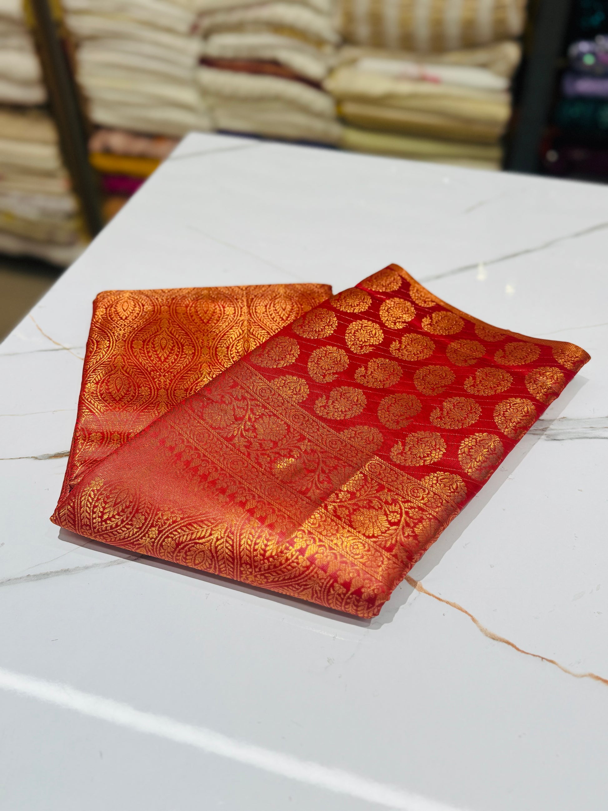 BANARASI SAREE- handwoven with intricate zari work and traditional motifs the body of the saree is completely in Banarasi work and the border is in mango motifs design and blouse piece is in the same tone of the saree with a simple Banarasi border in the end